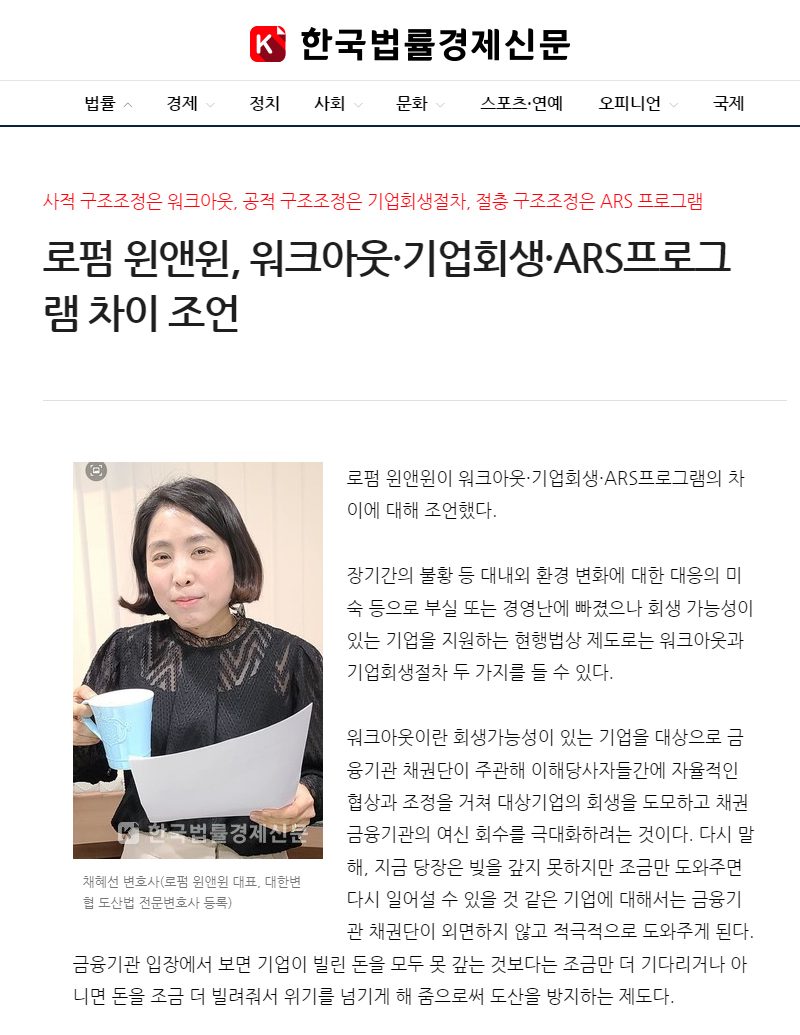 로펌 윈앤윈, 워크아웃·기업회생·ARS프로그램 차이 조언